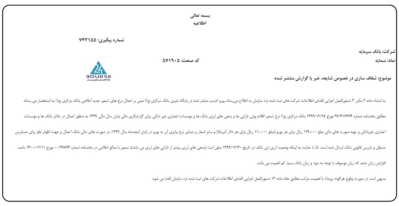 به گزارش کدال نگر بورس ٢۴، بانک سرمایه اعلام نمودنرخ تسعیر اقلام پولی دارایی ها و بدهی های ارزی بانک ها و موسسات اعتباری غیر بانکی برای گزارشگری مالی پایان سال مالی ١٣٩٩ به منظور اعمال در دفاتر بانک ها و موسسات اعتباری غیربانکی و تهیه صورت های مالی مبلغ ١٢٩.٠٠٠ ریال برای هر یورو (مبلغ ١١٠.٠٠٠ ریال برای هر دلار آمریکا) و سایر اسعار بر مبنای نرخ برابری آن به یورو در پایان اسفندماه سال ١٣٩٩، در صورت های مالی بانک اعمال و جهت اظهار نظر برای حسابرس مستقل و بازرس قانونی بانک ارسال شده است. لذا با عنایت به اینکه وضعیت ارزی این بانک منفی است (بدهی های ارزی بیشتر از دارایی های ارزی می باشد)، تسعیر با مبالغ اعلامی در بخشنامه باعث افزایش زیان شده، که زیان موصوف با توجه به سود و زیان بانک بسیار کم اهمیت می باشد.