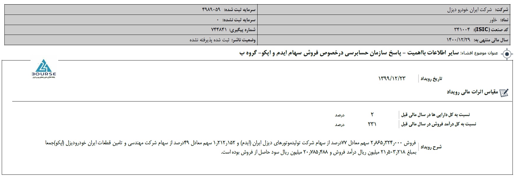 به گزارش کدال نگر بورس ٢۴، شرکت ایران خودرو دیزل اعلام نمود فروش ٠٠٠ر٣٢۴ر٨۶۵ر٢ سهم معادل ٧٧درصد از سهام شرکت تولیدموتورهای دیزل ایران (ایدم) و ١۵٢ر٢١٢ر١ سهم معادل ۴٩درصد از سهام شرکت مهندسی و تامین قطعات ایران خودرودیزل (اپکو)جمعا بمبلغ ٢١٨ر۵٠٣ر٢١ میلیون ریال درآمد فروش و ۴٨٨ر٧٨۵ر٢٠ میلیون ریال سود حاصل از فروش بوده است.