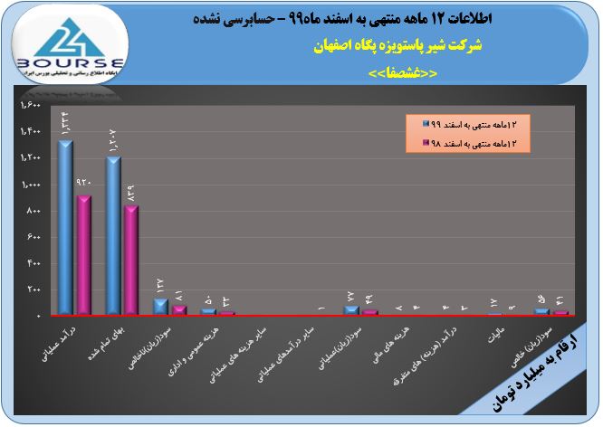 به گزارش کدال نگر بورس ٢۴، شرکت شیر پاستوریزه پگاه اصفهان در ١٢ماهه منتهی به اسفند ٩٩ سود ناخالص در این دوره با ۵٧ درصد رشد به ١٢٧ میلیارد تومان و سود خالص با رشد ٣٨ درصدی به ۵۶ میلیارد تومان رسید.