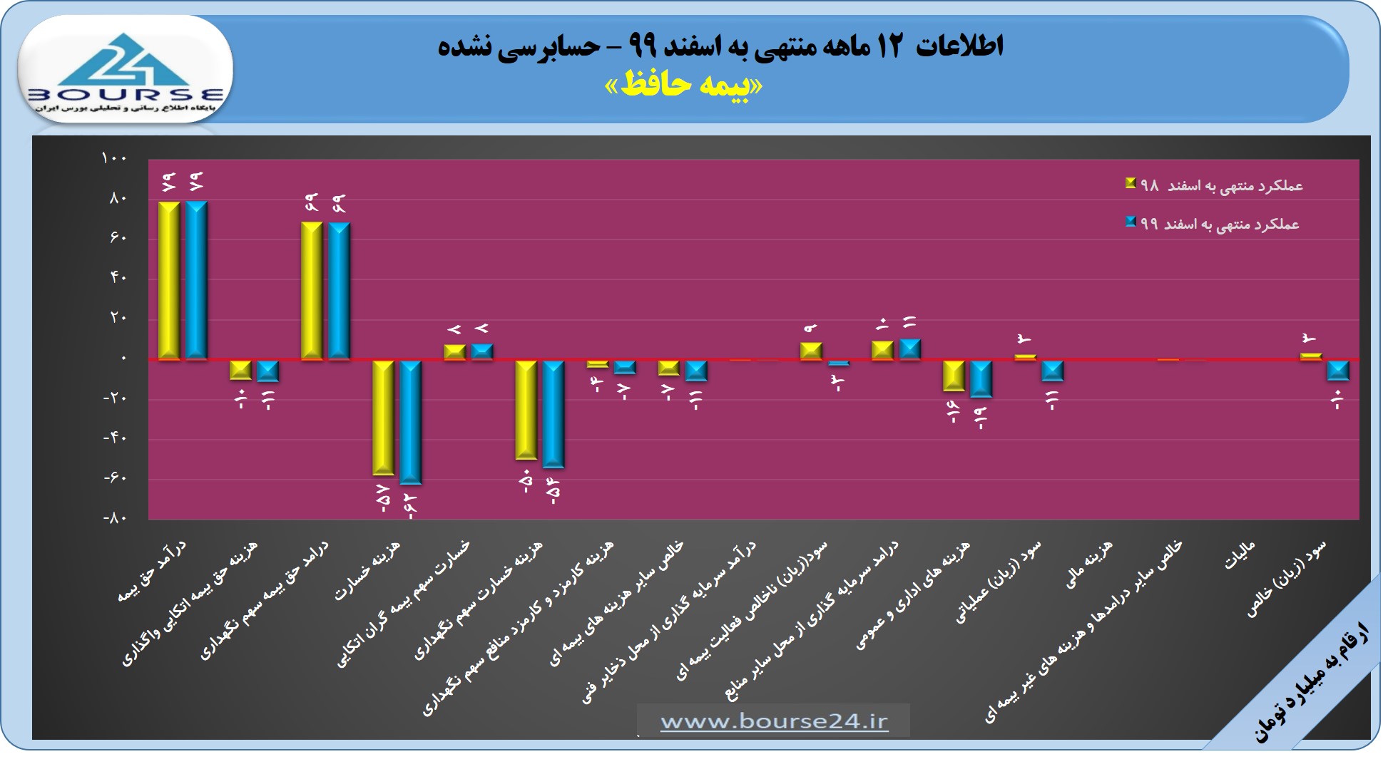 به گزارش کدال نگر بورس ٢۴ ، بیمه حافظ در ١٢ ماهه منتهی به اسفند ماه ٩٩ برای هر سهم خود ٨٣۵ ریال زیان محقق کرده است.
