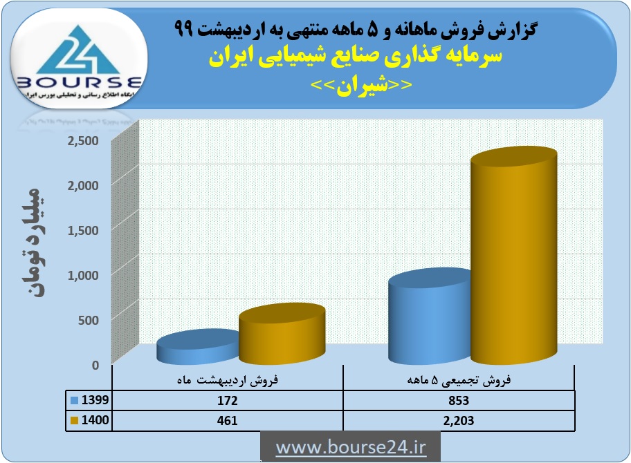 به گزارش کدال نگر بورس ٢۴ ، شرکت سرمایه گذاری صنایع شیمیایی ایران در ۵ ماهه سال جاری از فروش محصولات خود ٢٢٠٣ میلیارد تومان درآمد کسب نمود، که از این مبلغ ۴۶١ میلیارد تومان آن مربوط به همین ماه می باشد. گفتنی است مبلغ فروش این شرکت در مدت ۵ ماهه در مقایسه با مدت مشابه سال قبل ١۵٨ درصد رشد داشته است.گزارش بسیار خوبی است.