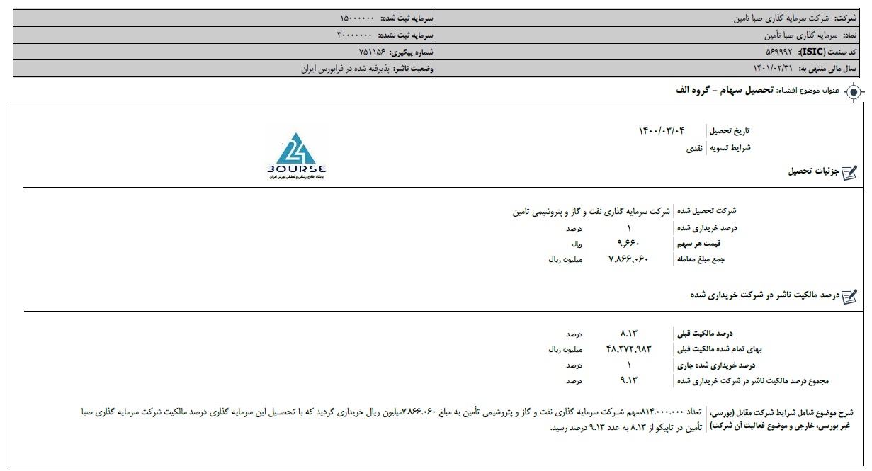 به گزارش کدال نگر بورس ٢۴، شرکت سرمایه گذاری صبا تامین اعلام نمود تعداد ٨١۴.٠٠٠.٠٠٠سهم شرکت سرمایه گذاری نفت و گاز و پتروشیمی تأمین به مبلغ ٧.٨۶۶.٠۶٠میلیون ریال خریداری گردید که با تحصیل این سرمایه گذاری درصد مالکیت شرکت سرمایه گذاری صبا تأمین در تاپیکو از ٨.١٣ به عدد ٩.١٣ درصد رسید.