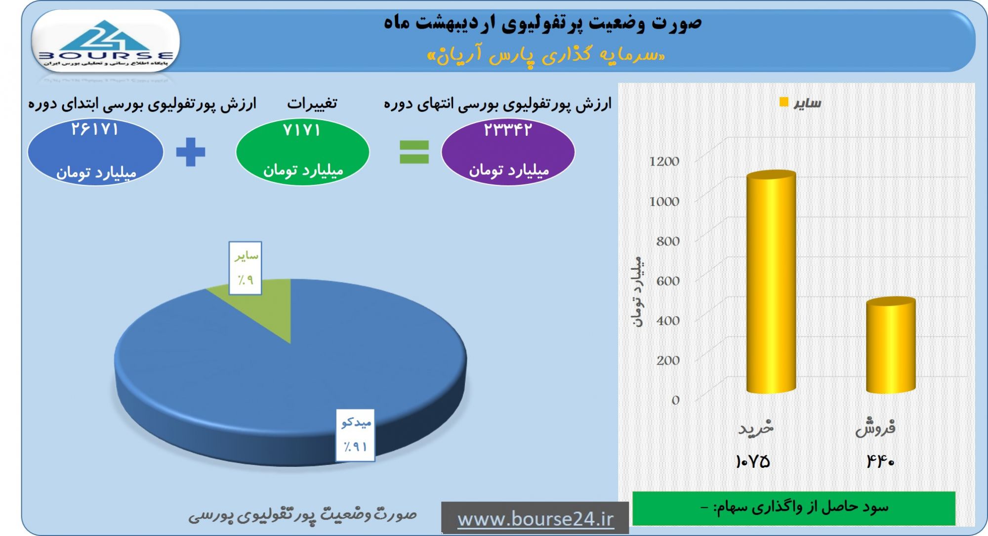 به گزارش کدال نگر بورس ٢۴، شرکت سرمایه گذاری پارس آریان در اردیبهشت ماه سودی شناسایی نکرد.