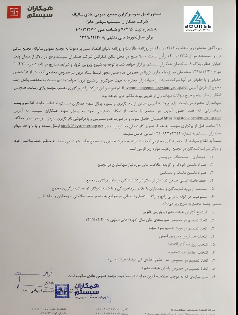 به گزارش کدال نگر بورس ٢۴، شرکت همکاران سیستم در خصوص نحوه برگزاری مجمع با توجه به شیوع بیماری کرونا شفاف سازی نمود.