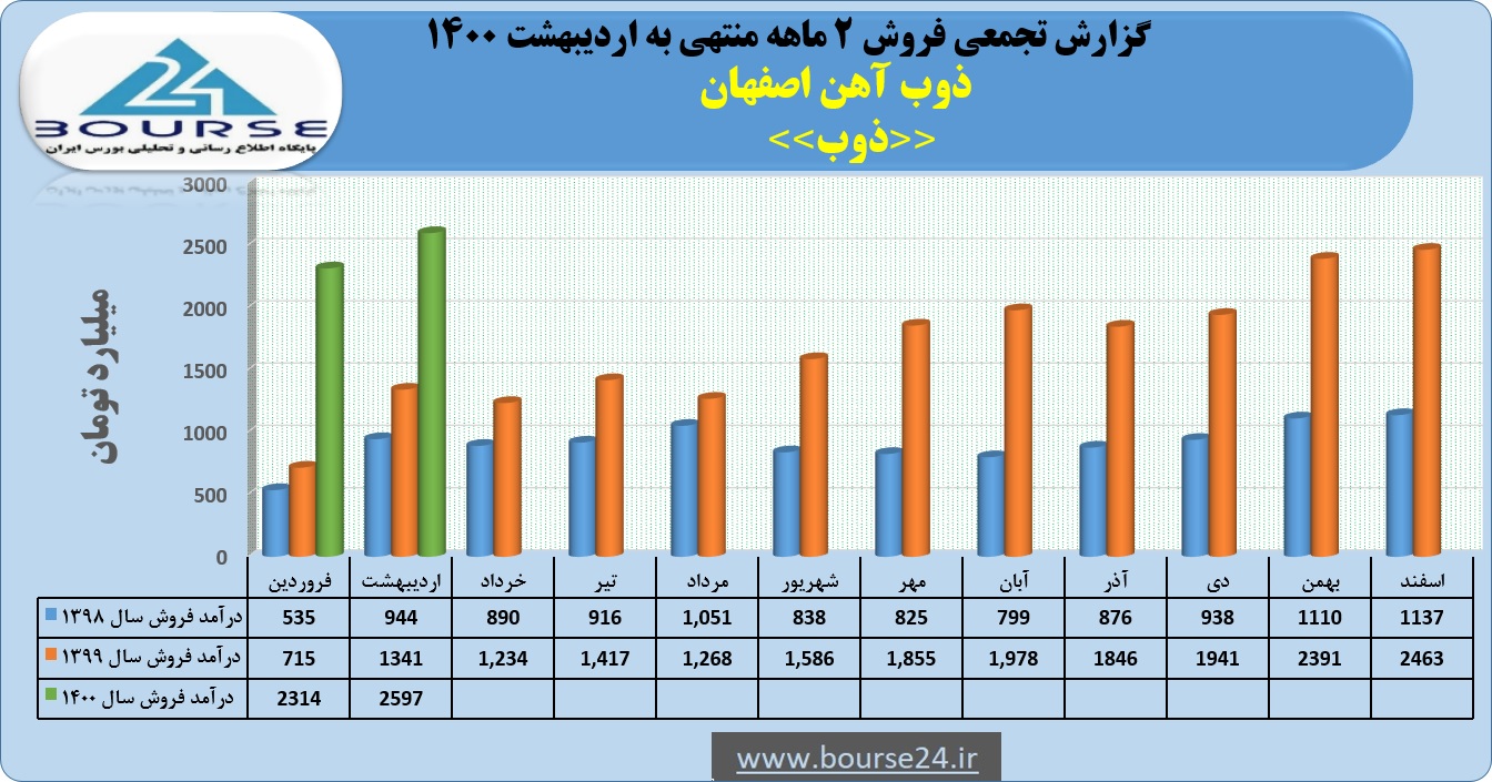 به گزارش کدال نگر بورس ٢۴ ، شرکت سهامی ذوب آهن اصفهان در ٢ ماهه سال جاری از فروش محصولات خود ۴٩١١ میلیارد تومان درآمد کسب نمود که از این مبلغ ٢۵٩٧ میلیارد تومان آن مربوط به همین ماه می باشد. گفتنی است مبلغ فروش این شرکت در مدت ٢ ماهه در مقایسه با مدت مشابه سال قبل ١١٢ درصد رشد داشته است.