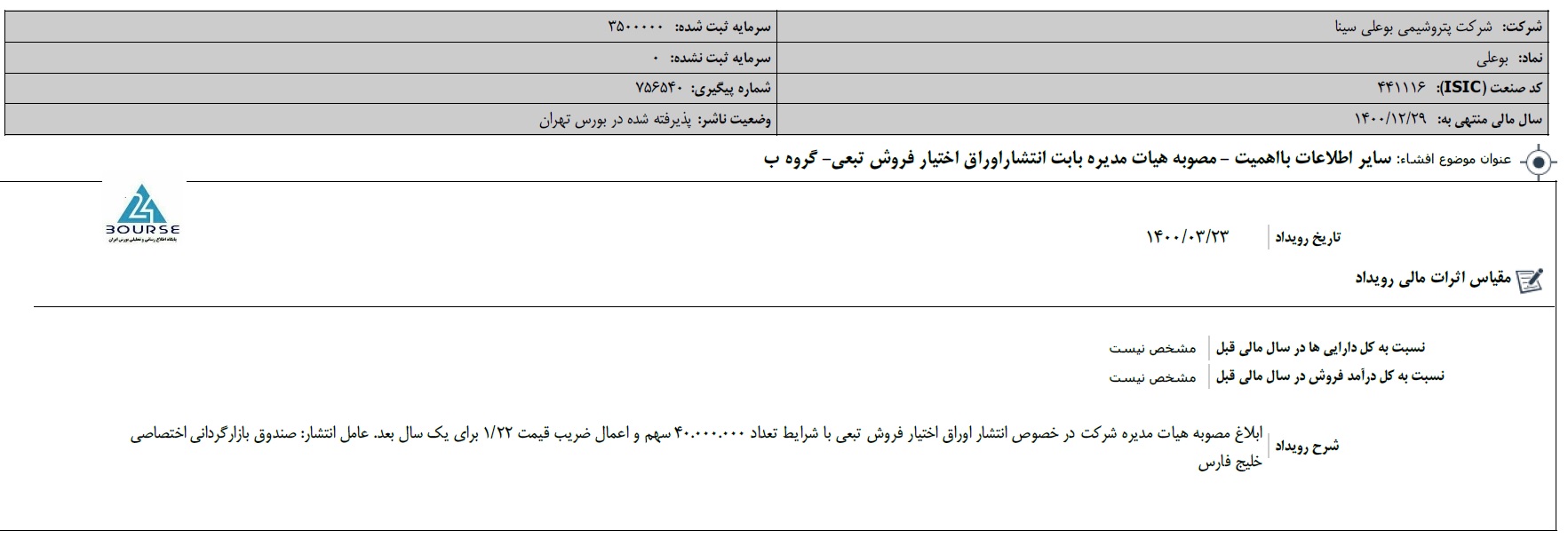 به گزارش کدال نگر بورس ٢۴، شرکت پتروشیمی بوعلی سینا از ابلاغ مصوبه هیات مدیره شرکت در خصوص انتشار اوراق اختیار فروش تبعی با شرایط تعداد ۴٠.٠٠٠.٠٠٠ سهم و اعمال ضریب قیمت ١.٢٢ برای یک سال بعد. عامل انتشار: صندوق بازارگردانی اختصاصی خلیج فارس خبر داد.