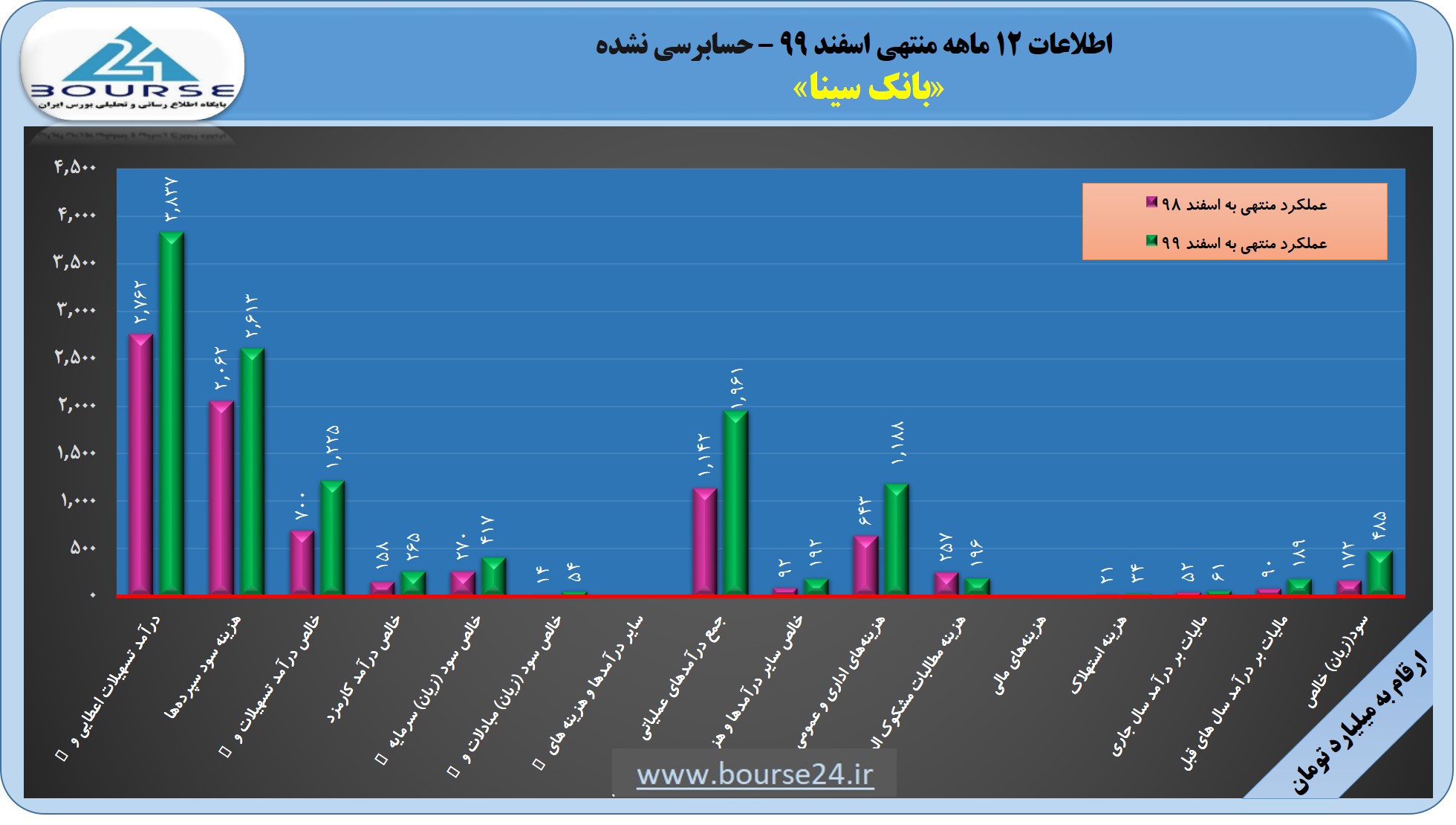 به گزارش کدال نگر بورس ٢۴، بانک سینا در ١٢ ماهه منتهی به اسفند ١٣٩٩ برای هر سهم با ١٨٢ درصد رشد، سودی معادل ١٩١ محقق نمود. خالص درآمد تسهیلات و سپرده گذاری ٧۵ درصد رشد داشت و به ١٢٢۵ میلیارد تومان رسید. هم چنین جمع درآمدهای عملیاتی با رشد ٧٢ درصدی به ١٩۶١ میلیارد تومان رسید.