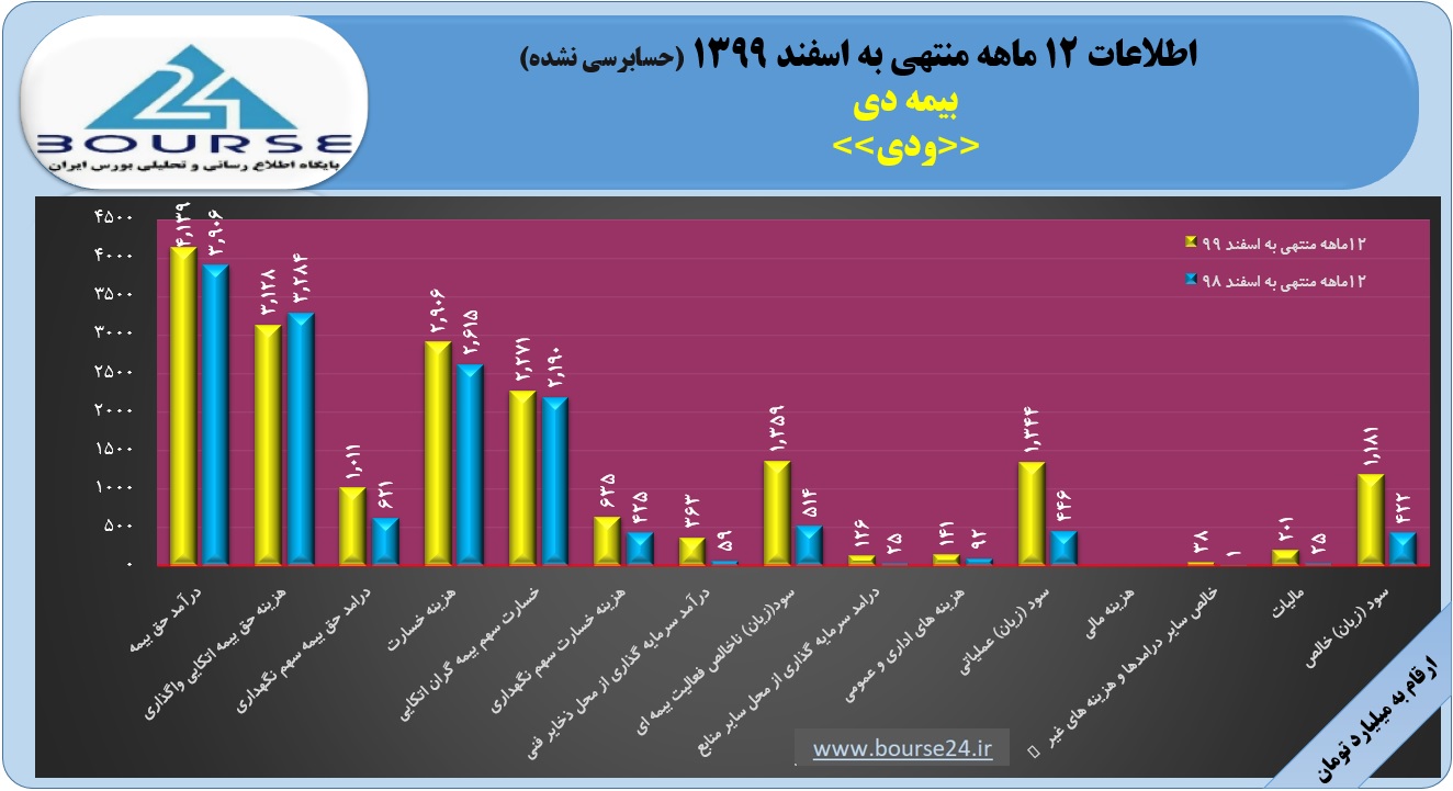 به گزارش کدال نگر بورس ٢۴ شرکت بیمه دی در ١٢ ماهه منتهی به اسفند ١٣٩٩ برای هر سهم ۴٧٢٣ ریال سود محقق کرد که به نسبت دوره مشابه قبل رشد ١٨٠ درصدی داشته است.