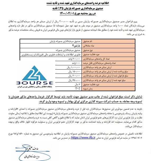 به گزارش بورس24 ، واحد های سرمایه گذاری تعهد شده و تادیه نشده صندوق سرمایه گذاری جسورانه پارتیان35درصد تادیه 1تیر ماه عرضه می شود.