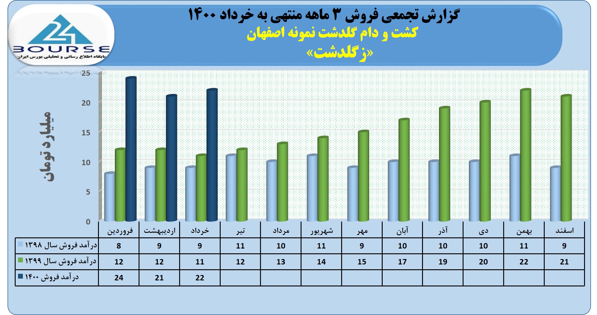 به گزارش کدال نگر بورس ٢۴، شرکت کشت و دام گلدشت نمونه اصفهان در خرداد ١۴٠٠ حدود ۶٨ میلیارد تومان درآمد از فروش محصولات خود به دست آورد.
