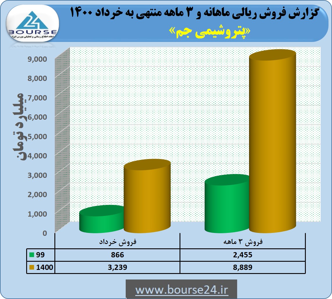 به گزارش کدال نگر بورس ٢۴ ، شرکت پتروشیمی جم در ٣ ماهه سال جاری از فروش محصولات خود ٨٨٨٩ میلیارد تومان درآمد کسب نمود که از این مبلغ ٣٢٣٩ میلیارد تومان آن مربوط به همین ماه می باشد. گفتنی است مبلغ فروش این شرکت در مدت ٣ ماهه در مقایسه با مدت مشابه سال قبل ٢۶٢ درصد رشد داشته است.
