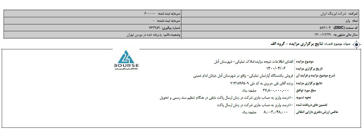 به گزارش کدال نگر بورس ٢۴،شرکت لیزینگ ایران اعلام داشت یکدستگاه آپارتمان تملیکی- واقع در شهرستان آمل خیابان امام خمینی را به فروش رسانده است. سود حاصل از این معامله ١٩ میلیارد ریال می باشد.