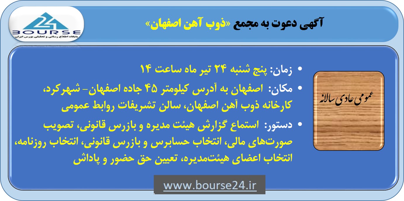 به گزارش کدال نگر بورس ٢۴، شرکت ذوب آهن اصفهان سهامداران خود را برای شرکت در مجمع عمومی عادی سالیانه فراخواند.