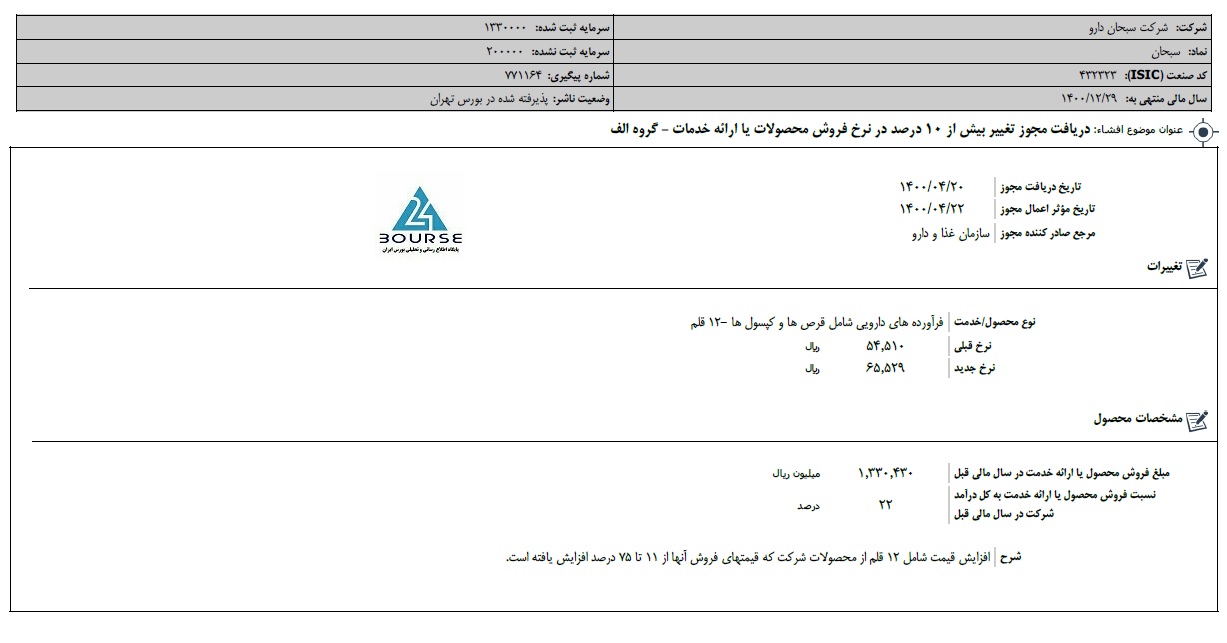 به گزارش کدال نگر بورس ٢۴، شرکت سبحان دارو اعلام نمود افزایش قیمت شامل ١٢ قلم از محصولات شرکت که قیمتهای فروش آنها از ١١ تا ٧۵ درصد افزایش یافته است.