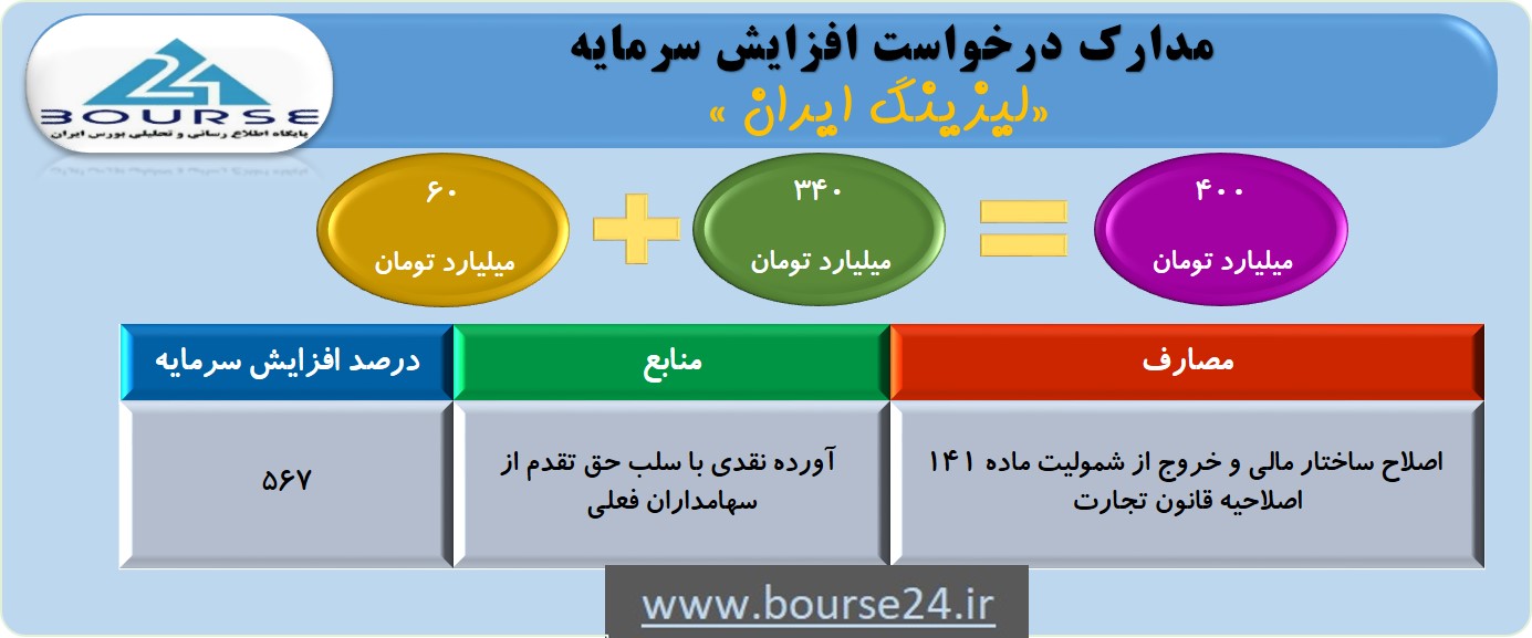 به گزارش کدال نگر بورس24 ، سازمان بورس مجوز افزایش سرمایه 567 درصدی شرکت لیزینگ ایران از محل آورده نقدی با سلب حق تقدم از سهامداران فعلی را صادر کرد.