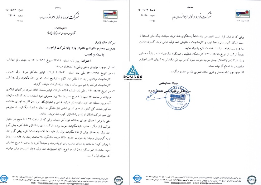 به گزارش کدال نگر بورس24 ، شرکت نورد و لوله اهواز در خصوص توقف فعالیت های شرکت توضیحات تکمیلی ارائه نمود.