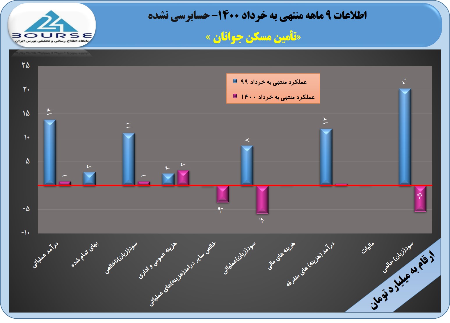 به گزارش کدال نگر بورس ٢۴ شرکت تأمین مسکن جوانان در ٩ ماهه منتهی به خرداد برای هر سهم ٢١ ریال زیان محقق کرد در حالی که در دوره مشابه قبل ٧٩ ریال سود ساخته بود.