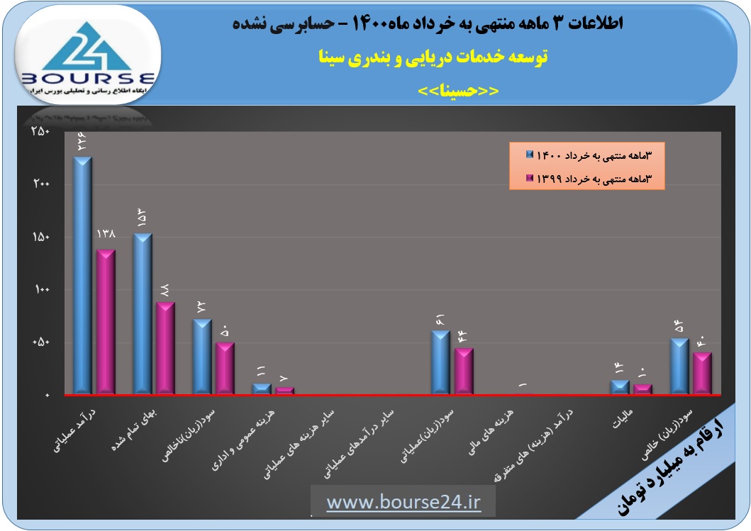به گزارش کدال نگر بورس ٢۴ ،شرکت توسعه خدمات دریایی و بندری سینا در ٣ ماهه منتهی به خرداد برای هر سهم ١٠٨١ ریال سود محقق کرد که نسبت به مدت مشابه قبل رشد ٣۵ درصدی داشته است.
