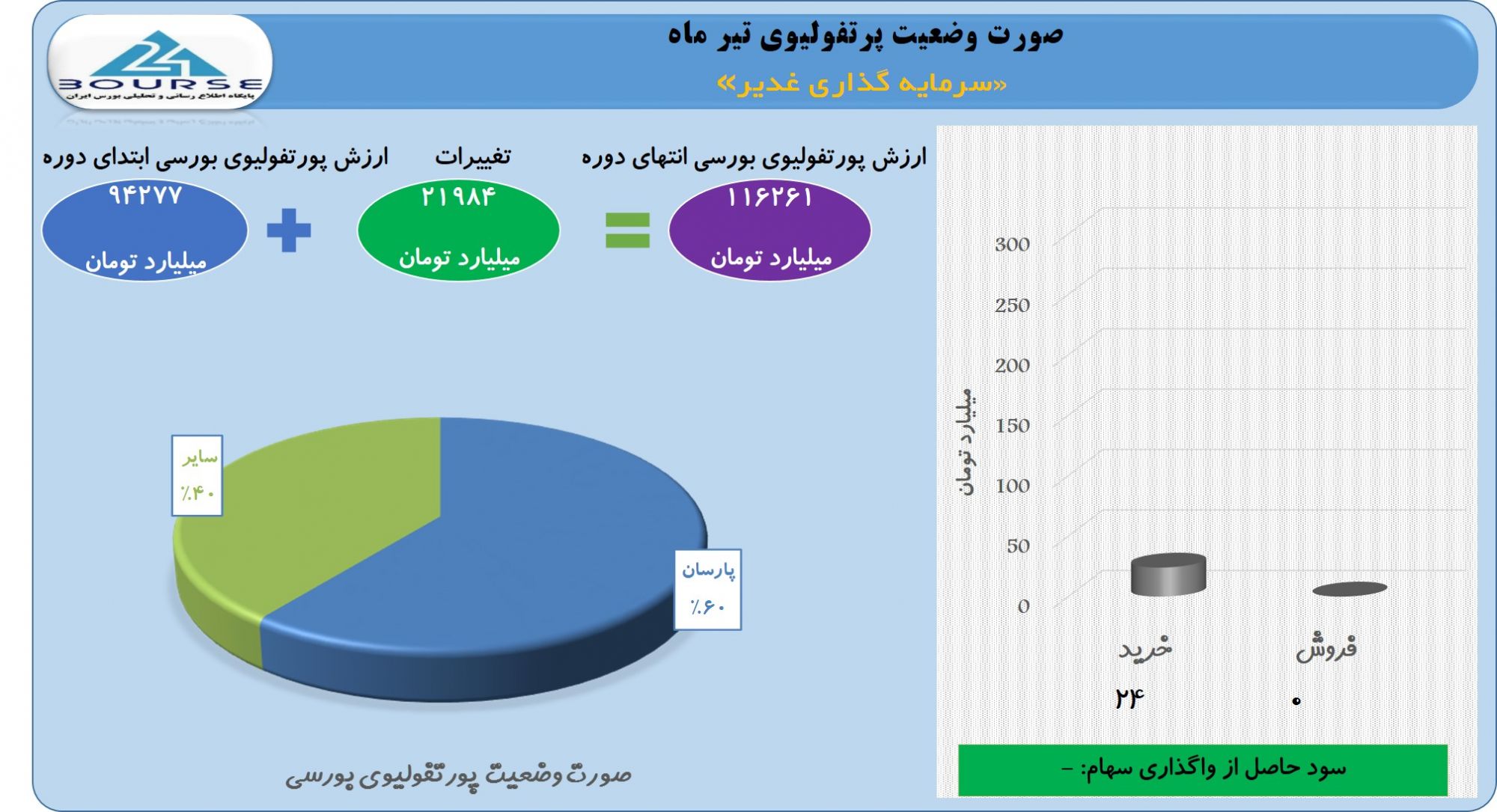 به گزارش کدال نگر بورس ٢۴، شرکت سرمایه گذاری غدیر در تیر ماه خرید و فروشی نداشت. ارزش پرتفوی این شرکت نیز ٢١٩٨۴ میلیارد تومان رشد داشت.