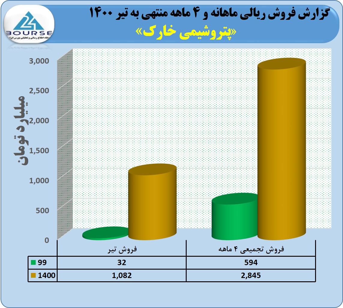به گزارش کدال نگر بورس ٢۴ شرکت پتروشیمی خارک در ۴ ماهه منتهی به تیر از فروش محصولات خود ٢٨۴۵ میلیارد تومان درآمد کسب نمود که از این مبلغ ١٠٨٢ میلیارد تومان آن مربوط به همین ماه می باشد. گفتنی است مبلغ فروش این شرکت در مدت ۴ ماهه در مقایسه با مدت مشابه سال قبل ٣٧٩ درصد رشد داشته است.