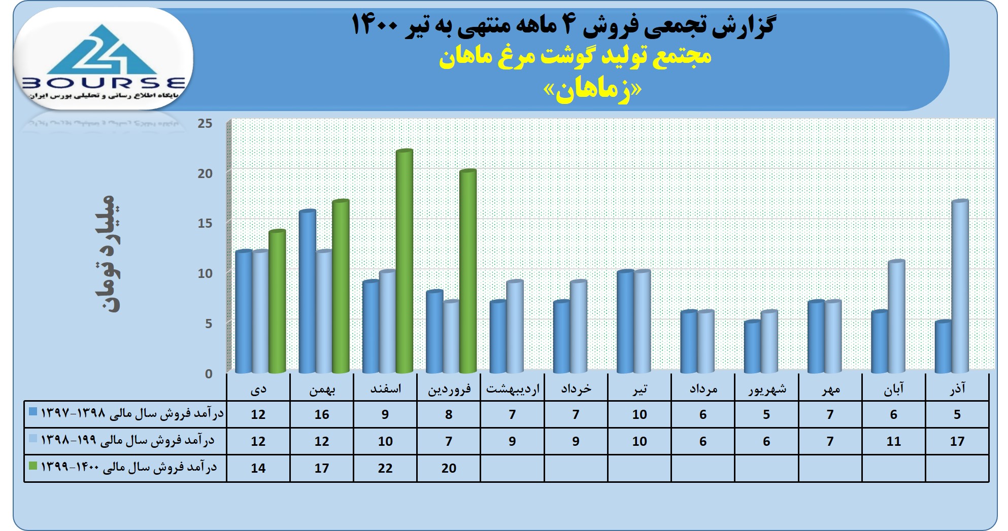 به گزارش کدال نگر بورس ٢۴، شرکت مجتمع تولید گوشت مرغ ماهان در مدت ۴ ماهه نخست ١۴٠٠ حدود ١٣۴ میلیارد تومان درآمد از فروش محصولات خود به دست آورد.