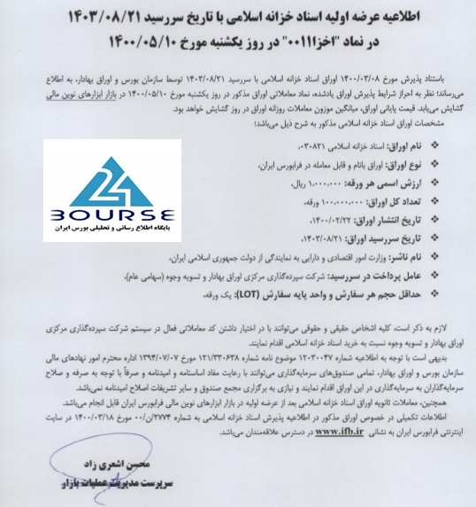 به گزارش بورس24 ، اسناد خزانه اسلامی با تاریخ سررسید 21 آبان 1403 در نماد «اخزا001» یکشنبه 10 مرداد عرضه اولیه می شود.