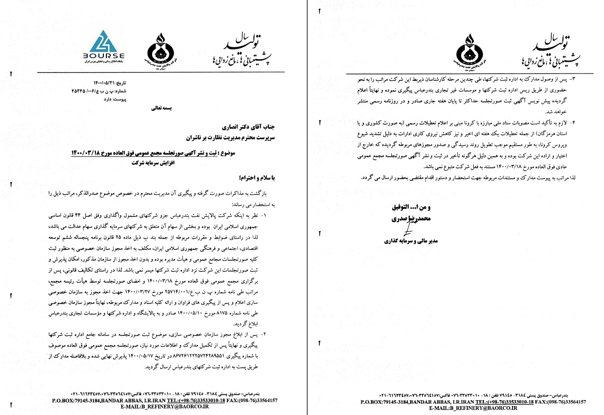 به گزارش کدال نگر بورس ٢۴، شرکت پالایش نفت بندرعباس در خصوص عدم ثبت صورتجلسه مجمع عمومی عادی فوق العاده مربوط به افزایش سرمایه، توضیحاتی ارائه نمود.