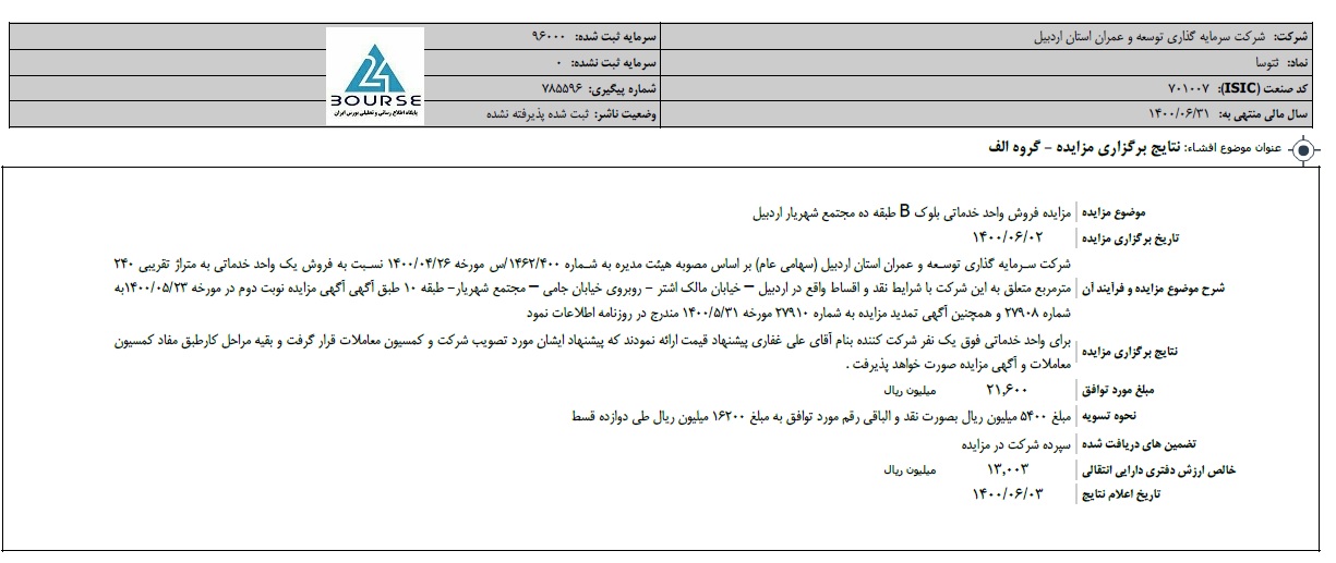 به گزارش کدال نگر بورس ٢۴، شرکت سرمایه گذاری توسعه و عمران استان اردبیل اعلام نمود یک واحد خدماتی به متراژ تقریبی ٢۴٠ مترمربع متعلق به این شرکت با شرایط نقد و اقساط واقع در اردبیل – خیابان مالک اشتر را به مبلغ ٢ میلیارد تومانی به فروش رسانده است.