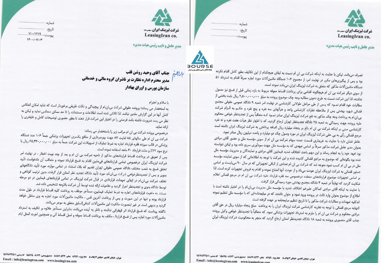 به گزارش کدال نگر بورس ٢۴، شرکت لیزینگ ایران در خصوص دعوای در خصوص تسهیلات اعطایی به شرکت بی ان ام توضیحات تکمیلی ارائه کرد.