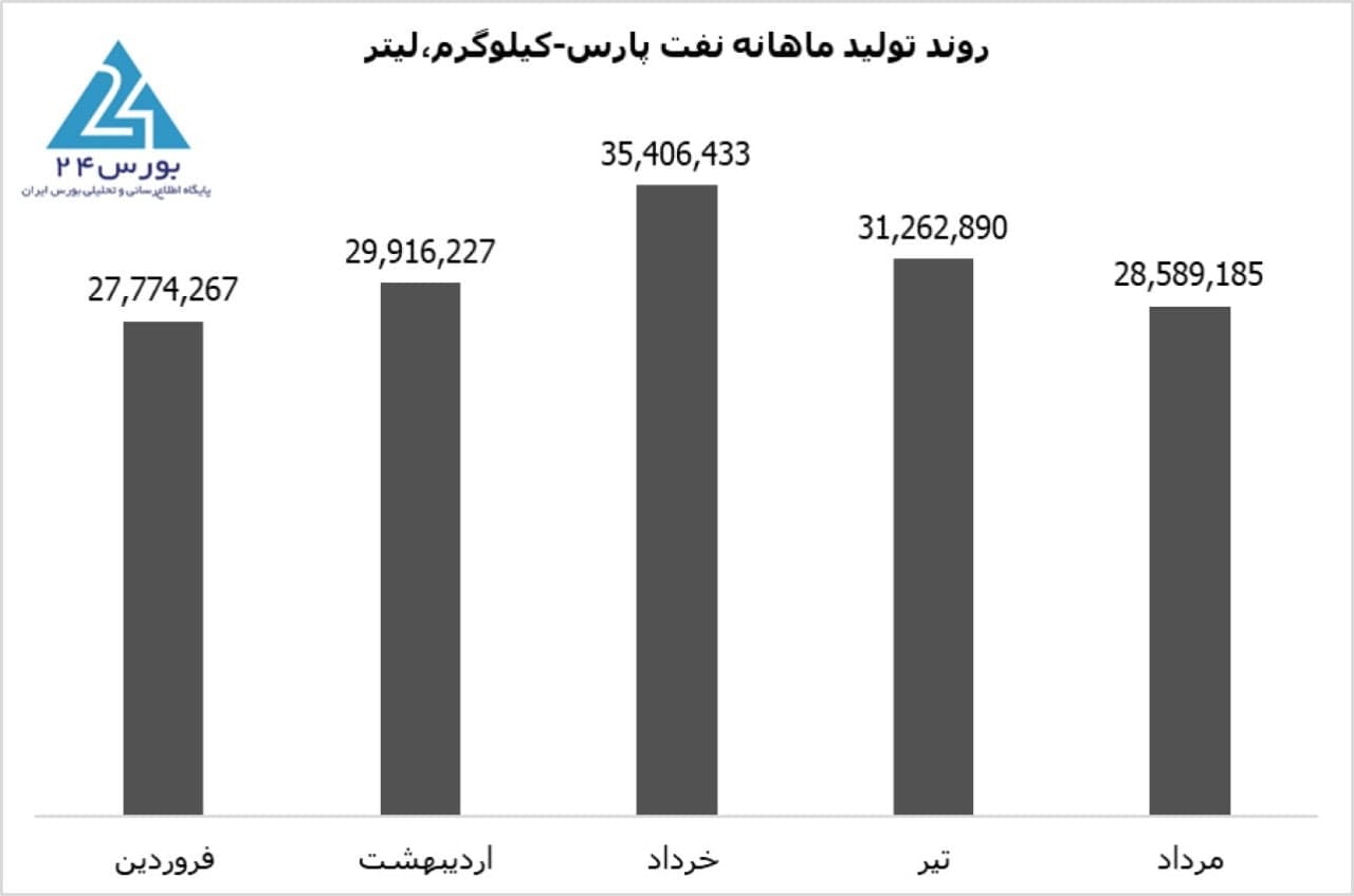 حجم تولیدات 5 ماهه ابتدایی سال جاری شرکت نفت پارس حدود 153 کیلوگرم-لیتر بود. فروش مقداری شرکت در این دوره بالغ بر 154 کیلوگرم لیتر و ارزش فروش محصولات آن بیش از 2،486 میلیارد تومان بود.