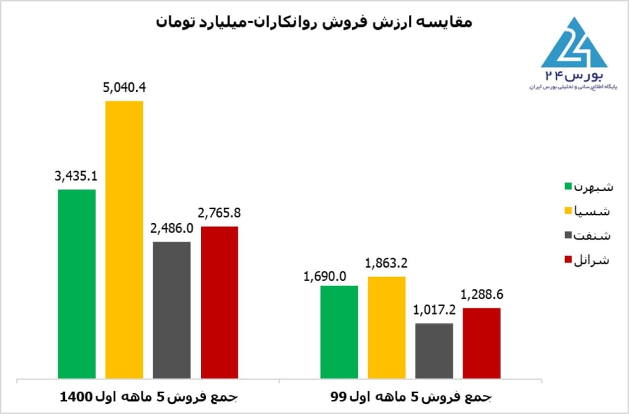 از لحاظ فروش ریالی (درآمدهای عملیاتی) در دوره 5 ماهه اول امسال نسبت به مدت زمان مشابه سال گذشته نفت نفت سپاهان با افزایش 171 درصدی، نفت پارس با رشد 144 درصدی، نفت ایرانول با افزایش 115 درصدی و نفت بهران با رشد 103 درصدی همراه شدند.