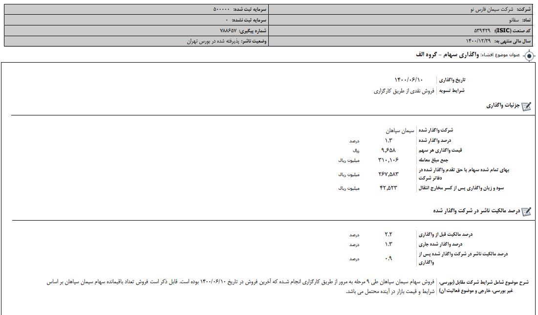 به گزارش کدال نگر بورس ٢۴، شرکت سیمان فارس نو اعلام نمود که فروش سهام سیمان سپاهان طی ٩ مرحله به مرور از طریق کارگزاری انجام شده که آخرین فروش در تاریخ ١۴٠٠.٠۶.١٠ بوده است. قابل ذکر است فروش تعداد باقیمانده سهام سیمان سپاهان بر اساس شرایط و قیمت بازار در آینده محتمل می باشد.