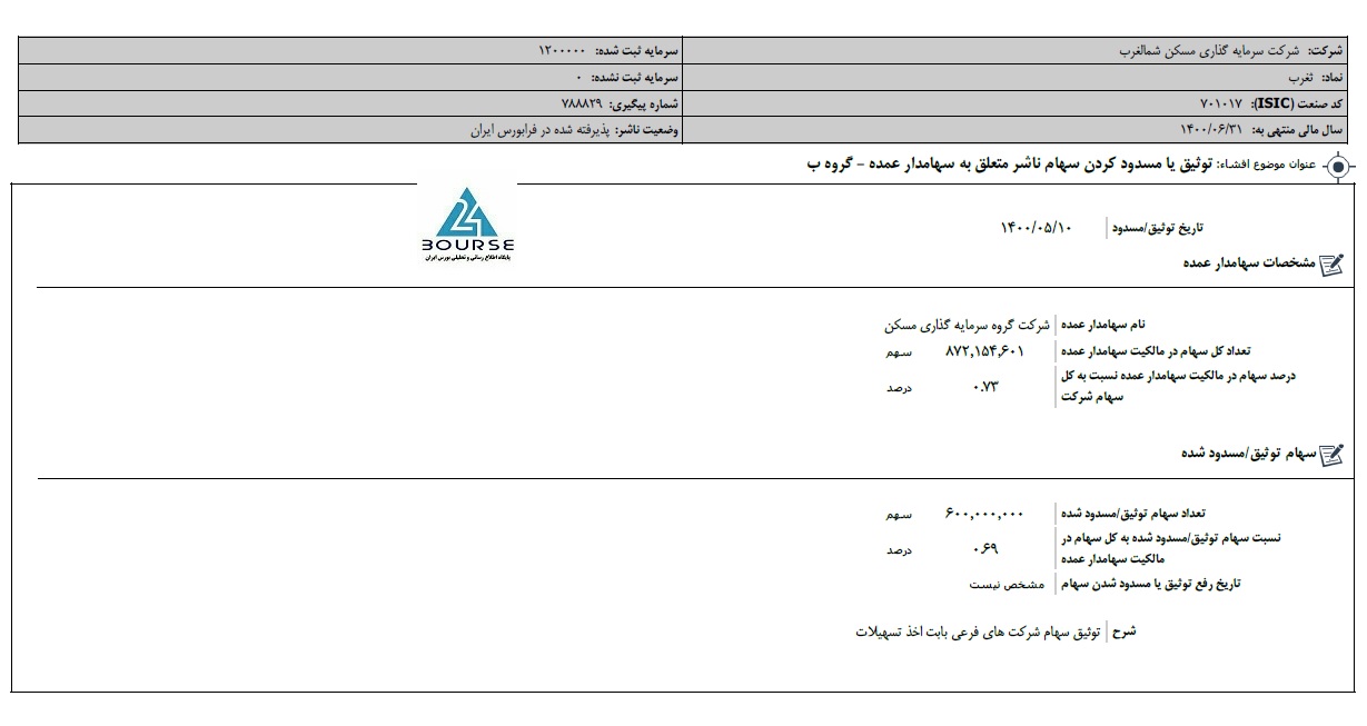 به گزارش کدال نگر بورس ٢۴، شرکت سرمایه گذاری مسکن شمالغرب اعلام نمود سهام این شرکت توسط گروه سرمایه گذاری مسکن سهام جهت اخذ تسهیلات به وثیقه گذاشته شده است.
