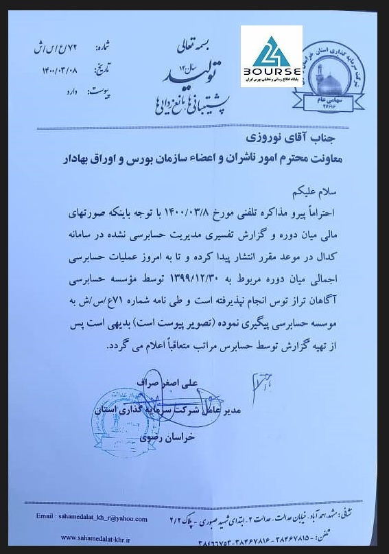 به گزارش کدال نگر بورس ٢۴، شرکت سرمایه گذاری سهام عدالت استان خراسان رضوی در خصوص آماده سازی و ارائه گزارش حسابرس شفاف سازی نمود.
