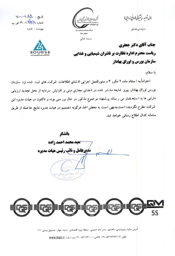 به گزارش کدال نگر بورس ٢۴، شرکت پتروشیمی بوعلی سینا اعلام نمود پیرو شایعه منتشر شده در فضای مجازی مبنی بر افزایش سرمایه از محل تجدید ارزیابی دارایی ها به استحضار می رساند پیشنهاد موضوع مذکور در حال بررسی بوده و تاکنون در هیات مدیره این شرکت مطرح نگردیده است.