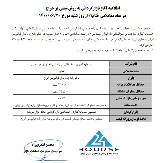 به گزارش بورس ٢۴، نماد شرکت سرمایه گذاری ساختمانی بین المللی نام آوران مهندسی از تاریخ ٢٠ شهریور بازارگردانی می شود.