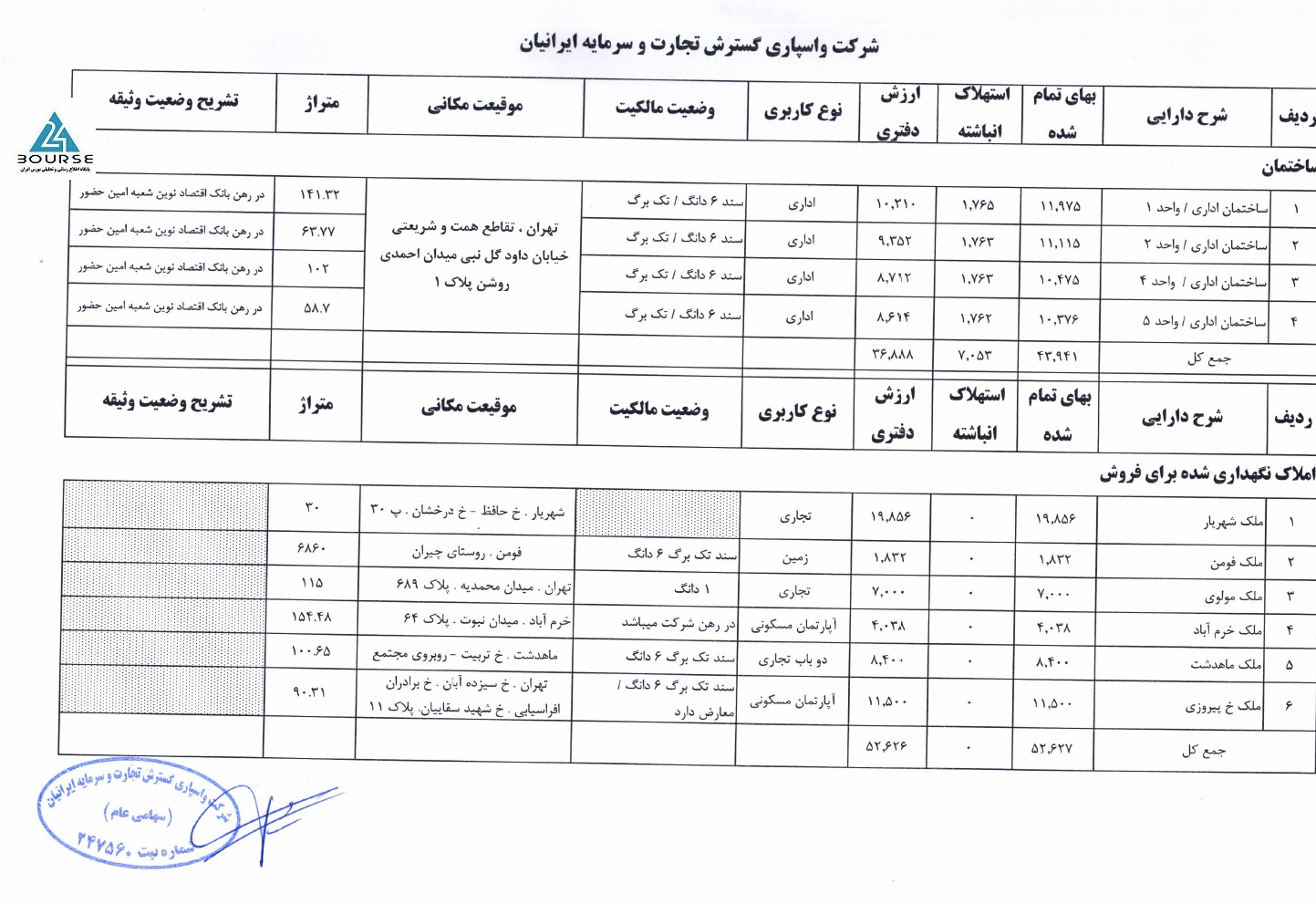 به گزارش کدال نگر بورس24 ، شرکت واسپاری گسترش تجارت و سرمایه ایرانیان وضعیت زمین و ساختمان شرکت را افشا نمود.