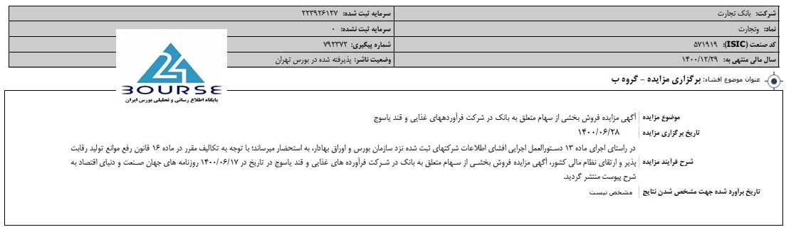خبر خوب برای بانک تجارت/یک زیر مجموعه با قیمت پایه ٣٠٩ میلیارد تومان به مزایده گذاشته شد
