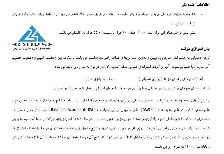 به گزارش کدال نگر بورس ٢۴، کارخانجات سیمان صوفیان در گزارش تفسیری اعلام داشت، با توجه به افزایش نرخ های فروش سیمان و فروش کلیه محصولات از طریق بورس کالا انتظار می رود در ٩ ماهه پایان سال درآمد فروش شرکت افزایش یابد. - پیش بینی فروش صادراتی برای سال ١۴٠٠ مقدار ۶٠ هزار تن سیمان و ۵۵ هزار تن کلینکر می باشد.