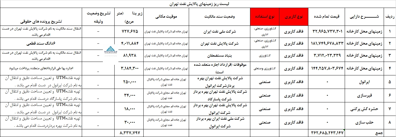 به گزارش کدال نگر بورس ٢۴، شرکت پالایش نفت تهران لیست زمین و ساختمان شرکت را منتشر نمود.