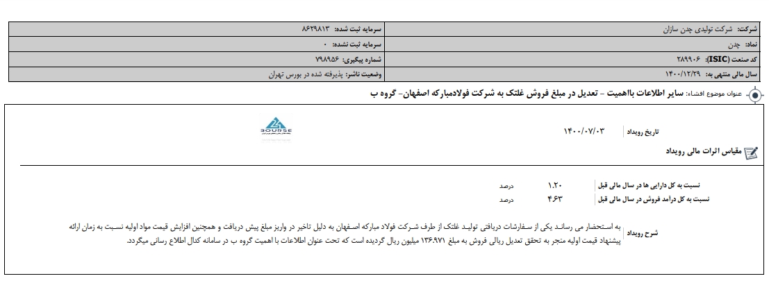 به گزارش کدال نگر بورس ٢۴، شرکت تولیدی چدن سازان اعلام نمود که یکی از سفارشات دریافتی تولید غلتک از طرف شرکت فولاد مبارکه اصفهان به دلیل تاخیر در واریز مبلغ پیش دریافت و همچنین افزایش قیمت مواد اولیه نسبت به زمان ارائه پیشنهاد قیمت اولیه منجر به تحقق تعدیل ریالی فروش به مبلغ ١٣۶.٩٧١ میلیون ریال گردیده است که تحت عنوان اطلاعات با اهمیت گروه ب اطلاع رسانی میگردد.