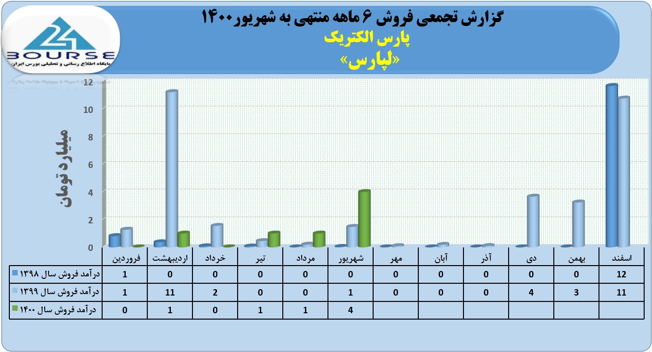 به گزارش کدال نگر بورس ٢۴،پارس الکتریک در ۶ماهه منتهی به شهریور ١۴٠٠ حدود ٧ میلیارد تومان فروش داشته است.
