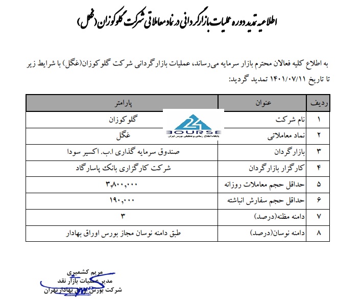 به گزارش کدال نگر بورس ٢۴، بازارگردانی نماد گلوکوزان تا تاریخ ١١ مهر ١۴٠١ تمدید شد.