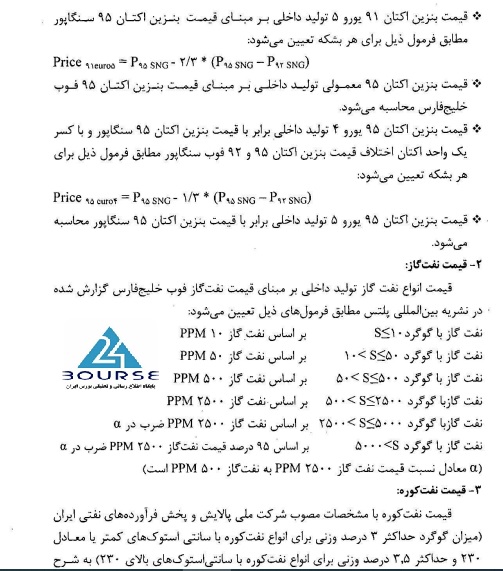 به گزارش بورس ٢۴، وزارت نفت نرخ خوراک پالایشگاه ها را ابلاغ نمود. بدین صورت قیمت هر بشکه نفت خام تحویلی بر اساس فرمول های پیوست و با لحاظ درجه API واقعی نفت خام اندازه گیری شده تحویلی نسبت به API=٣٣.٣١ برای نفت خام سبک و API=٢٩.١۴ برای نفت خام سنگین در هر ماه شمسی محاسبه می گردد. قیمت گاز مایع برابر میانگین ماهانه قیمت نرخ پروپان و بوتان فوب خلیج فارس گزارش شده در نشریه بین المللی پلتس و با لحاظ درصد پروپان و بوتان تحویلی پالایشگاه ها می باشد...