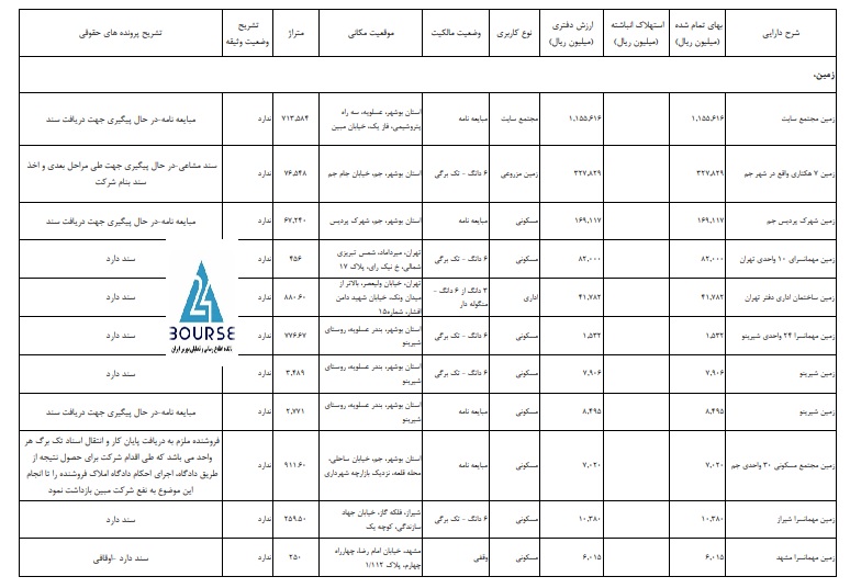 به گزارش کدال نگر بورس ٢۴، شرکت مبین انرژی خلیج فارس فهرست زمین و ساختمان خود را منتشر کرد.
