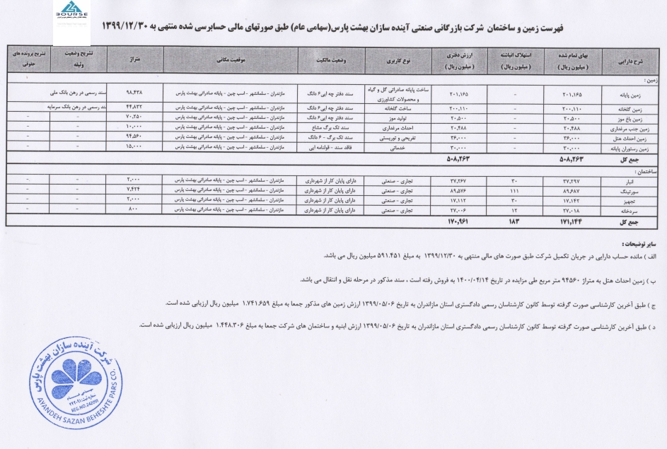 به گزارش کدال نگر بورس ٢۴، شرکت بازرگانی صنعتی آینده سازان بهشت پارس فهرست زمین و ساختمان شرکت را منتشر کرد.