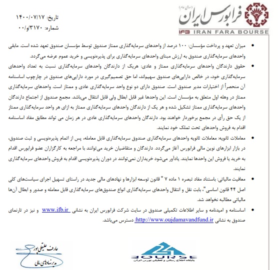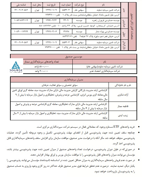 این صندوق قابل معامله در فرابورس می باشد.ارزش مبنای هر واحد هزار تومان می باشد.حداقل سرمایه ٢٠ میلیارد تومان و حداکثر ٢٠٠ میلیارد تومان می باشد.نوع صندوق سرمایه گذاری در سهام می باشد.