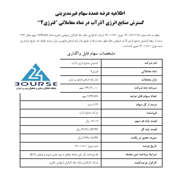 به گزارش بورس ٢۴، ٢.٢٣ درصد سهام شرکت گسترش صنایع انرژی آذر آب به قیمت پایه هر سهم ١٧١٠٧ ریال در تاریخ ١ آبان عرضه عمده می شود.فروشنده شرکت صنایع آذرآب می باشد.
